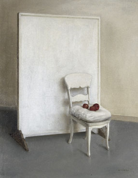 of the ripe-red fruit on the chair, the apples become unlikely protagonists