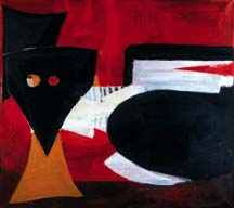 Creature II, 1982, oil on canvas, 42.5" x 46.5" Mischa Richter was born in Kharkov, Russia, in 1910. He describes a childhood house that was filled with song and neighborhood streets filled with magicians and acrobats. Richter's work table was beside a window that overlooked the garden, with large sand walks and purple lilacs. Days were spent learning French and German from his Governess, drawing at that table, and playing in Gogol Park: "I don't know when I started drawing. It was long before I started collecting bullets." In 1917 the Revolution erupted around the Richter household. Richter's uncle was killed shortly after joining the Red Army and Richter almost died from a bout with typhoid fever. As the war gained momentum, the festive streets became places of violence. As Commissar of Waterworks of the City of Kharkov, Richter's father was able to erect a temporary economic and academic cushion around his family, providing art tutors, and vacations to Berdyansk. However, being in a position of responsibility the possibility of execution became imminent. The family decided to leave for the United States. The escape went so smoothly that Mischa Richter hardly remembers being scared. His family left on his father's vacation taking only their clothes, a few suitcases, and a rolled up painting of a seascape in Yalta by Buchumov. They took the train to the Polish border, a cart through the forest and a rowboat into Poland. Their year spent waiting for a visa was one of relaxation and further art training. The passage to the United States was extremely smooth. Cousins met the family at Ellis Island, where they spent no more than an hour. Mischa resumed his art education immediately after arriving in Boston, at the Museum School. The program included daily drawings from the extensive collection of Greek and Roman casts. It was also at the Museum School that Richter met his lifelong friend Will Barnet who was, eight years later, to introduce Richter to Barnet's sister-in-law, Helen Sinclair Annand, also a painter. Richter fell in love immediately and as he is fond of saying, "never left her from then until 1992." Richter went directly from the Museum School to Yale University, where he studied the earth palette of Eugene Savage. Richter graduated from Yale in 1934 and moved from New Haven back to Boston. In Boston, as part of the WPA, he completed the first narrative mural in Boston at the since-demolished Bouroughs Newsboy Foundation building. The fifty-foot realist mural depicted a newsboy working his way up through the ranks with the professional encouragement of his superiors, which metaphorically connoted worker-friendly management practices. It was written at the time that, Richter's WPA work "shows him to be an artist of depth and power." Though immediately very successful working for the WPA, Richter quickly turned his professional interests to cartooning. "I never separated cartooning from art in general. I was brought up in an atmosphere of satire and political discussion." Richter's deeply engrained sense of social justice emerges in his artwork. Working intensely with Ad Reinhardt, Richter began drawing for and then became the arts editor of the New Masses, a leading Progressive paper. As liberal intellectuals, Helen and Mischa Richter were closely involved with the Communist movement. However, his enthusiasm for an American Communist Revolution was tempered by his awareness of Stalin's capacity for violence. "GET ME THE STATUE OF LIBERTY" Richter's cartooning brought him a substantial salary for the 1940's. He developed the syndicated strip "Strictly Richter" for King Features and did contract work for The New Yorker. He did extensive advertising and had cartoons in Collier's, The Saturday Evening Post, This Week and others. He also published several books, including three for children. His financial security allowed him to paint for his personal enjoyment, without the pressures of making gallery sales. Richter said that though he paints, "I don't show them. If somebody thinks they're good twenty years from now why that will be fine. In the meantime I don't have to stand around and be insulted."1 He has never allowed the art market to infringe upon his enjoyment of medium, line, or creativity. In the 1950's and 'sixties, Richter made several lengthy trips to Italy and France. In Italy, he spent mornings drawing cartoons for publication and his afternoons walking and painting. Richter did a series of drawings, or "translations" extracting a geometrical expression of the Italian Masterpieces' compositions. He then exhibited these works, along with cartoons, in a 1958 exhibition at the Wadsworth Antheneum in Hartford CT. Richter's work at this time reflected his involvement in the artistic dialogue that abounded as members of the New York School summered in Provincetown. Richter socialized with many of the familiar names of Abstract Expressionism, including Will Barnet and Robert Motherwell. "During the 'fifties and 'sixties I was influenced by Abstract Expressionism which directed me towards communicating through the formal rather than narrative qualities of my art." Richter first came to Provincetown in 1928 and joined the Beachcombers Art Club in the '50s. He began exhibiting his work at the Art Association in 1950 and has shown here consistently ever since. He bought his first house in Provincetown in 1958. In 1969 Mischa helped found the historical cooperative Provincetown Group Gallery where he showed with many of America's most famous artists. Richter took a hiatus from public exhibition of his work, which ended in the early 'nineties, after the deaths of his wife and son, Tom Richter. Mischa nursed Helen through her slow debilitation from multiple sclerosis, refusing to have her put in a nursing home. Sasha Richter, Mischa's grandson, described Mischa during Helen's illness as compassionate and devoted. In one of his upstairs windows hangs a painting of Tom Richter as a boy.