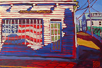 Dan’s unique manner of depicting the Provincetown streets and architecture rests on his method of painting on a red ground, laying on multiple colors that generate their own resonance and speak to the viewer with a very strong sense of completeness. Dan is one of the plein-air painters seen in Provincetown, his easel on his back, as he goes about finding his subject – a unique building, side street or site he can paint. His engaging personality bespeaks an individual in love with his medium, his location and the people who inhabit it. [more]